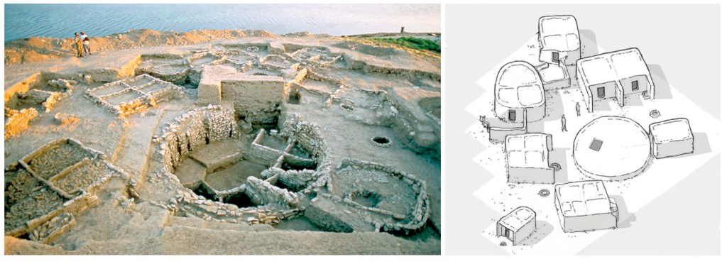 C’est aussi sur ces rives de l’Euphrate, au nord de la Syrie, qu’au cours de fouilles préventives réalisées avant la construction d’un barrage a été découvert un site archéologique majeur maintenant englouti sous des mètres d’eau comme d’autres sites célèbres. Ce site de Jerf el Ahmar (-9500/-8700 av. JC; carte#1) est important car il correspond, comme d’autres, à la période de transition entre regroupement de quelques maisons et organisation de villages conséquents qui marque cette période charnière du Néolithique. Les fouilles ont permis de mieux comprendre l’évolution des techniques utilisées pour bâtir ces maisons et de se rendre compte à quel point celles des villages actuels voisins ressemblent aux plus récentes du site Néolithique.