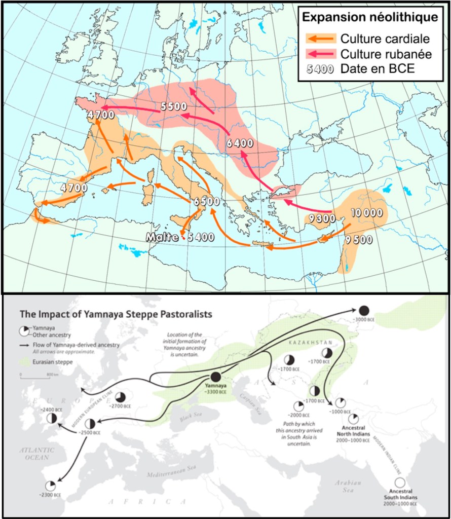 A la même époque (-9000 av JC), le reste de l’Eurasie, comme le reste de la planète, est peuplée de chasseurs-cueilleurs descendants des premiers hommes modernes à avoir colonisé ce continent et y avoir remplacé Neandertal (frise#2). L’agriculture y débarque d’Anatolie progressivement à partir de –7 000 av JC, en suivant deux routes différentes, l’une vers le nord en suivant le Danube et l’autre vers l’ouest par les côtes méditerranéennes, deux routes correspondant à deux cultures caractérisées par les décorations à la surface de leurs poteries (linéaire/cardiale ou rubanée, carte#2). Ces deux fronts de migration se rejoignent 2 000 ans plus tard sur le territoire correspondant à la France actuelle au moment où nait en Bretagne, là où se finit la terre, la culture mégalithique (chroniques#19,20). Certains ont aimé croire à une invention indépendante de l’agriculture et de l’élevage en Europe, d’autres ont voulu y voir la diffusion d’une culture, d’un nouveau mode de vie qui se serait imposé de lui-même aux chasseurs-cueilleurs locaux, ravis de laisser tomber la chasse à l’aurochs et aux bisons pour passer au travail des champs. Mais il n’en est rien.