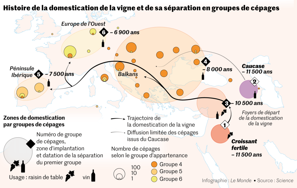 PS: un article publié dans Science en 2023 (voir références ci-dessous) a démontré qu’il y a eu en fait deux sources indépendantes de domestication de la vigne, l’une dans le Caucase (2 dans la figure ci-dessus), comme je l’indiquais dans cette chronique, et une autre dans le Croissant Fertile (1 dans la figure) qui est en fait l’ancêtre de la quasi-totalité des cépages actuels.