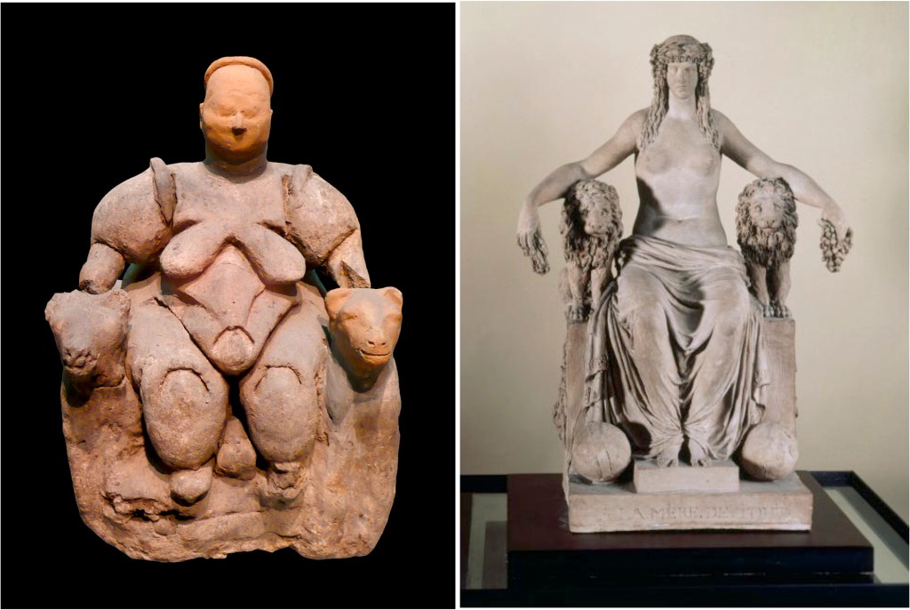 Certains pensent qu’elle représente la déesse mère de toute vie, à une époque où la majorité des statuettes retrouvées représentaient soit des animaux, soit des femmes aux formes généreuses, bien avant la mise en place des sociétés guerrières testostéronées qui leur succéderont. Cette divinité du Néolithique domine la nature de ses mains posées sur les deux félins qui l’entoure. Elle a sans doute été transmise aux Phrygiens, venus du nord de la Grèce, et qui ont occupé la région où se trouve Çatal Höyük plusieurs millénaires plus tard. Chez les phrygiens, à qui on doit notre bonnet révolutionnaire, symbole de liberté chez les esclaves romains, elle a pris le nom de Cybèle, déesse mère des dieux, transmise aux grecs et aux romains et redécouverte pendant la révolution française… la seconde statue date de 1795.