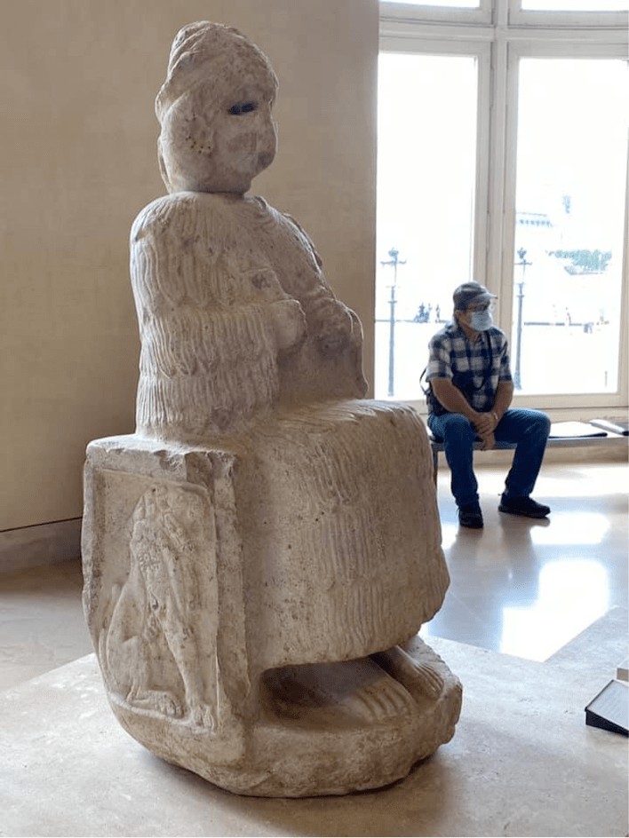 Post-scriptum (aout 2021): Lors d’une visite du département des antiquités orientales au Louvre, je suis tombé par hasard sur cette statue de la déesse Narundi qui date du règne du roi Elamite Kutik-Inshushinak (Suse, Iran actuel, 2 100 av JC). Je n’ai pas pu m’empêcher de penser à celles de Cybèle et de son ancêtre de Çatal Höyük, tout aussi sereinement assise entre deux lions, figurés de chaque côté de son trône.