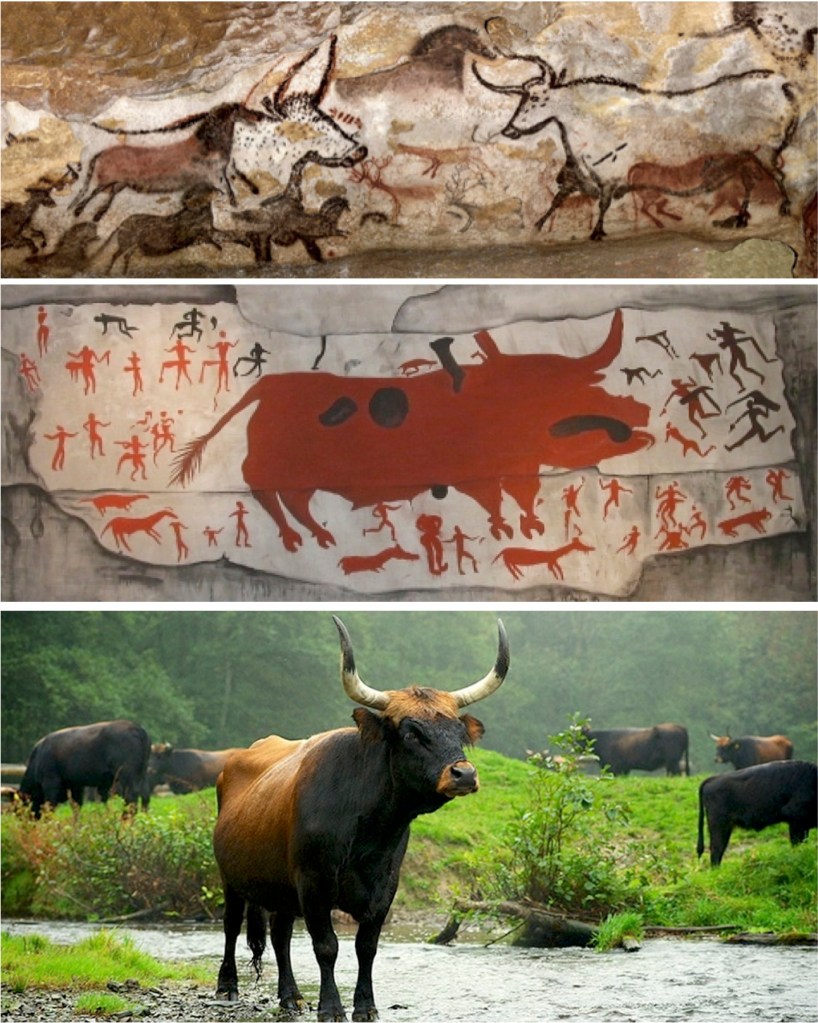 L’aurochs est l’ancêtre de notre vache actuelle, femelle du taureau, bien que la plupart de nos contemporains pensent sans doute que le taureau soit une espèce à part qu’on ne trouve qu’en Espagne, ou dans le sud de la France, dont la femelle serait la vachette. Comme nos autres espèces domestiques, cette bête impressionnante a été domptée il y a à peu près 10 000 ans par les néo-paysans du Croissant fertile, sans doute aux pieds des monts Taurus qui lui ont donné son nom latin (Bos taurus). Ce fut l’un des derniers gros animaux de nos fermes à être domestiqué après la chèvre, le mouton et le cochon. Les études génétiques récentes ont montré que cette domestication correspond vraisemblablement à un seul (ou quelques) événement à partir de moins de 100 individus. Toutes les vaches actuelles (1,7 milliards) descendent donc de ces quelques aurochs du sud de l’Anatolie qui se sont laissés domestiquer. La sélection des individus les plus dociles et les moins dangereux a permis de réduire jusqu’à faire disparaître ses cornes impressionnantes et, on l’imagine, dangereuses pour ces cow-boys du Néolithique qui n’avaient pas encore domestiqué le cheval (voir chroniques#4, #15).