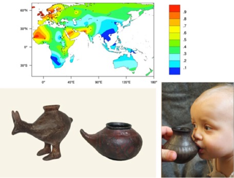 Quoi qu’il ait pu en coûter aux premiers nourrissons testeurs de ce nouveau régime, le lait animal, sans doute complémenté en céréales, a pu offrir la possibilité de sevrer les enfants plus tôt et donc de raccourcir le temps entre deux grossesses. L’invention du biberon et du Blédilait version Néolithique a certainement participé au boom démographique de ces populations, connu sous le nom de transition démographique néolithique, leur permettant de poursuivre leur conquête territoriale vers l’ouest. Les fouilles réalisées dans certains villages néolithiques d’Europe centrale ont mis à jour des céramiques qui semblent correspondre aux premiers biberons de l’histoire dont les plus récents, en forme d’animaux et/ou de sein maternel, sont bien différents des tristes biberons actuels! Le côté moins mignon de cette découverte est que c’est le fait d’avoir retrouvé ces récipients dans des sépultures d’enfants qui a permis de vraiment comprendre à quoi ils servaient…