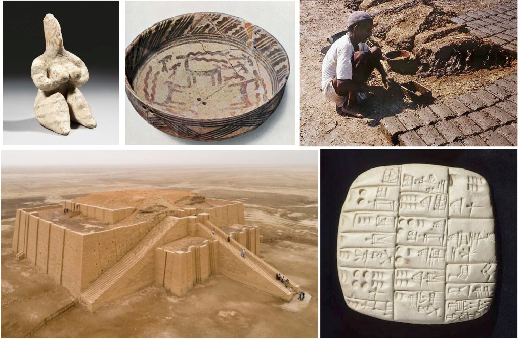 Je vous ai déjà parlé de cette période révolutionnaire qui a vu naître dans l’esprit des habitants du Croissant fertile, ces changements radicaux qui vont les conduire à se sédentariser et à apprivoiser la nature. L’appellation Néolithique ne reflète pas vraiment ce changement majeur pour l’avenir de notre espèce, ni pour celui de l’ensemble des espèces vivantes de la planète, elle ne reflète pas non plus l’importance d’un autre matériau, l’argile, dont l’utilisation va grandement participer à modeler ce que nous sommes devenus. La maîtrise de l’argile va en effet jouer un rôle central dans cette région, et ailleurs, car elle sera à la base d’inventions tout autant révolutionnaires que la domestication des plantes et des animaux, et qui marqueront notre quotidien jusqu’à nos jours, beaucoup plus que la pierre polie.