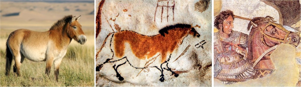 On a longtemps cru qu’on devait la domestication du cheval à la culture de Botaï qui s’épanouit au Néolithique final au Kazakhstan (-4 000 av JC). Sur le site qui donna son nom à cette culture furent découverts des dizaines de milliers d’ossements de chevaux qui semble avoir été la seule source de nourriture animale de ce peuple. Les traces archéologiques indiquent que des chevaux étaient parqués dans des enclos et des résidus de lait de jument ont même été retrouvés dans des récipients en céramiques suggérant que les Botaï avaient bien été parmi les premiers à avoir domestiqué le cheval, en tout cas à avoir essayé… Les études génétiques récentes ont cependant montré que les chevaux des Botaï étaient l’ancêtre du cheval de Przewalski qui n’est pas l’ancêtre du cheval domestique actuel. Contrairement à ce qui s’est passé en Mésopotamie pour la vache, le mouton et la chèvre, la domestication du cheval par les Botaï fut donc une voie sans issue. Pour la petite histoire, le cheval de Przewalski a bien failli disparaître, tout comme l’aurochs, il ne survivait que grâce à quelques couples parqués dans des zoos avant de bénéficier d’un grand plan de retour à la vie sauvage. Aujourd’hui plus de 2000 individus galopent libres dans les steppes de Mongolie, d’autres autour de Tchernobyl, ils représentent donc les derniers chevaux « sauvages » de la planète, si on omet qu’ils furent domestiqués il y a 6 000 ans, en tout cas certains d’entre eux. Un groupe français et leurs collaborateurs viennent tout récemment d’identifier ce jusque-là très mystérieux ancêtre commun à tous les chevaux domestiques actuels. Il aurait été apprivoisé il y a un peu plus de 4 000 ans quelque part dans le nord du Caucase. On ne sait pas à quoi il ressemblait exactement mais il s’est imposé au reste du monde et a donné toutes les variantes que l’on connaît actuellement, du percheron au poney en passant par le pur-sang, par le jeu des croisements et de la sélection.