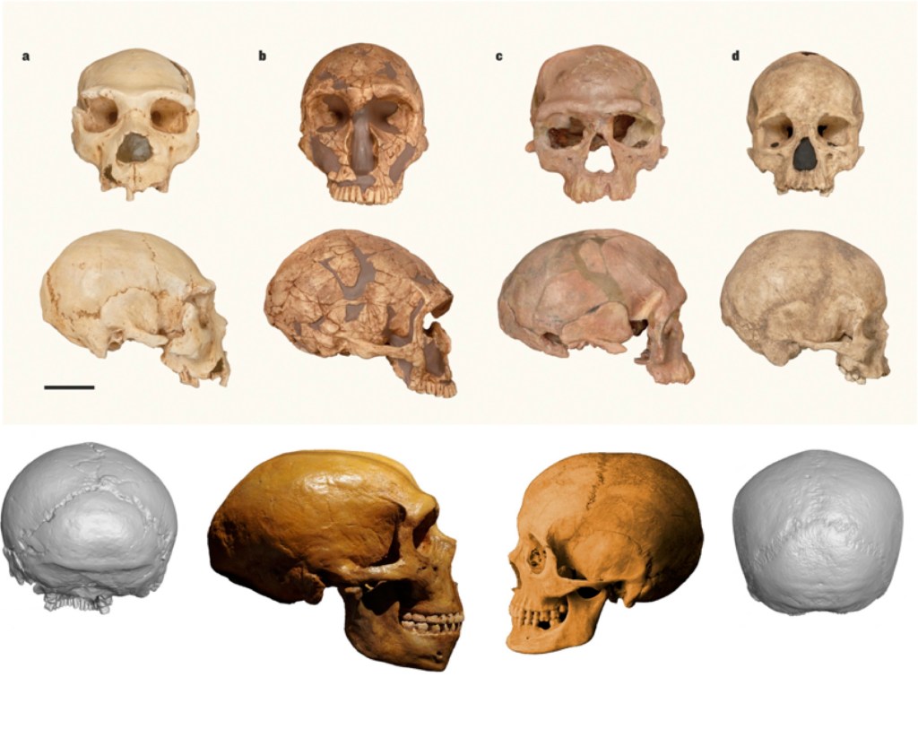 Quand les premiers représentants de notre lignée sont-ils apparus? Qu’est ce qui fait de nous une espèce humaine à part? Même si certaines de nos productions matérielles peuvent être utilisées pour essayer de répondre à ces questions fondamentales, les paléoanthropologues, qui sont pour certains à la quête des fossiles de notre lignée, et parfois à quel prix (PALéO#2.1), sont à la recherche de marqueurs physiques, visibles sur les squelettes, leur permettant de différencier et de classer les différentes espèces humaines qui se sont succédé. Nous savons que Homo sapiens, l’homme anatomiquement moderne (Moderne), est apparu il y a plus de 200 000 ans quelque part en Afrique (est, sud ou nord?). Pour essayer de répondre plus précisément aux questions où et quand, il est essentiel d’identifier des critères morphologiques qui permettent de définir l’engagement dans la lignée Moderne. La plupart de ces critères reposent sur l’étude comparative des crânes qui sont parfois complets mais la plupart du temps fragmentés, calotte crânienne, face et/ou mandibules, dont chaque partie peut apporter des renseignements précieux pour identifier la lignée à laquelle appartenait l’individu en question. De toutes ces comparaisons, certains traits, soit en positif (si on voit ça, on peut dire que), soit en négatif (si il n’y a pas ça, on peut avancer que), ont permis d’y voir un peu plus clair mais la partie de notre anatomie qui semble nous différencier, nous et nos premiers ancêtres Moderne, de toutes les autres lignées n’est pas celle à laquelle on aurait pu penser a priori…
