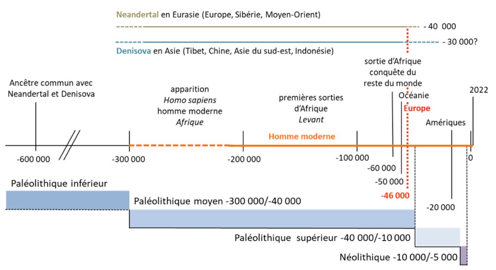 Homme moderne (Moderne). Homo sapiens ou Homme anatomiquement «moderne» en opposition aux formes «archaïques» (Erectus, Neandertal, Denisova, etc…) est l’unique espèce humaine peuplant la terre depuis la disparition de toutes les autres (estimation -30 000 ans). Les études fossiles et génétiques montrent que Moderne apparaît en Afrique (Eve africaine) il y a au moins 200 000 ans avant d’en sortir à plusieurs reprises pour finalement partir à la conquête du reste du monde il y a à peu près 60 000 ans. Au cours de ces migrations il s’est hybridé (reproduit) d’abord avec Neandertal (entre -150 000 et – 50 000) puis avec Denisova (entre -50 000 et -30 000). Au cours de ses échanges nous avons hérité d’une partie du génome de ces espèces archaïques, on parle alors d’introgression (transfert de gènes entre deux espèces).
