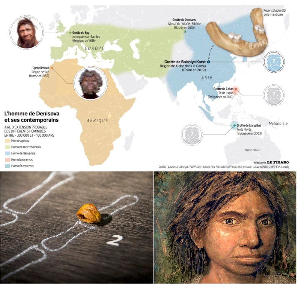 La façon dont fut découvert Denisova aurait été digne d’un roman de science-fiction d’il y a 25 ans. De très nombreux ossements de Neandertal, des crânes et des squelettes plus ou moins complets, ont été trouvés dans toute l’Europe depuis sa découverte au XIXème siècle. Ce n’est pas le cas pour Denisova. Cette espèce fut découverte en 2010 par le séquençage de l’ADN contenu dans un minuscule fragment de phalange trouvé dans la grotte du même nom, en Sibérie, proche de la frontière avec la Chine et la Mongolie (voir illustration). Les paléoanthropologues et l’équipe de Svante Pääbo pensaient sans doute avoir à faire à des restes néandertaliens mais leur analyse démontra qu’il s’agissait en fait d’une phalange ayant appartenu à une jeune femme d’une autre espèce, apparentée mais significativement différente, qui prit donc le nom de cette grotte. La grotte de Denisova est d’une richesse archéologique incroyable puisque son occupation par les humains remonte à 300 000 ans et que trois espèces s’y sont succédé et rencontrées. Les analyses génétiques des ossements qui y ont été retrouvés ont confirmé la présence de Denisova et de Neandertal et révélé le fruit de leur rencontre par le séquençage d’un fragment d’os d’une femme née il y a 90 000 ans d’un père Dénisovien et d’une mère Néandertalienne. D’autres études ont confirmé les échanges entre Neandertal et Denisova qui se sont vraisemblablement rencontrés dans cette vaste région frontière entre Europe et Asie, leurs deux territoires respectifs.
