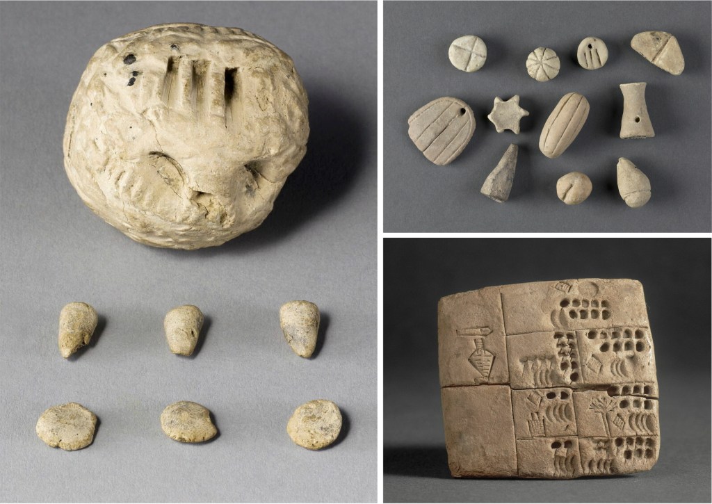 Les bulles représentent une seconde étape de ce système. Les jetons d’argile y étaient enfermés – scellés – ce qui devait permettre de garder la trace d’une transaction, d’une vente ou d’un échange, ou d’un dépôt dans les réserves communautaires. Il suffisait de briser la bulle pour vérifier la quantité échangée ou pour valider la transaction. Peut-être est-ce l’ancêtre du bon de livraison permettant de vérifier la quantité de ce qui avait été envoyée? Les bulles vont elles-mêmes évoluer en se complexifiant au début du quatrième millénaire. Des sceaux seront imprimés à leur surface permettant d’identifier les parties prenantes de ces transactions, puis les jetons eux-mêmes, par pression avant que l’argile ne se solidifie. Cette dernière étape devait permettre de facilement connaître le contenu des bulles sans avoir à les ouvrir. Des milliers de ces bulles imprimées datant du quatrième et du troisième millénaire seront retrouvées à Uruk, première cité-État, et dans la plupart des autres cités de Mésopotamie.