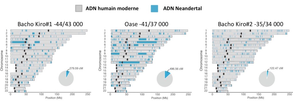 Les données génétiques sont aussi rares pour les premiers Moderne européens qui auraient pu croiser Neandertal. Très peu d’ossements ont été retrouvés pour cette période du paléolithique supérieur initial (illustration#1). Seuls quelques individus ont pu être analysés; trois sur le territoire actuel de la Bulgarie (Bacho Kiro, -45 000), un en Tchéquie (Zlatý kůň, -43 000), et un en Roumanie (Oase, -40 000). Des introgressions néandertaliennes ont été retrouvées chez ces tous ces individus. Le plus fascinant est que la génétique permet de déterminer à quand remontent les événements d’hybridation. On peut en effet se faire une idée précise du nombre de générations écoulées en mesurant la longueur des fragments d’ADN de Neandertal retrouvés dans le génome des Moderne. Plus on s’éloigne de l’hybride ancestral, plus la longueur des fragments d’introgression raccourcit à cause des évènements de recombinaison entre chromosomes d’une même paire qui se produisent au cours de la formation des spermatozoïdes et des ovules (méiose). Le spécimen Moderne retrouvé en Roumanie (Oase) présentait un des plus fort taux d’introgression néandertalienne (6 à 9%) et la longueur de certains des fragments indique qu’il avait un (ou une) aïeul Neandertal remontant à 4-6 générations seulement, tout comme les individus les plus anciens de Bulgarie (Bacho Kiro), correspondant donc à des hybridations récentes qui se seraient produites sur le territoire européen au cours de leur migration vers l’ouest (illustration#1, 3). Les résultats d’une très large étude couvrant l’ensemble du paléolithique supérieur en Europe (-40 000/-12 000) montre que tous les individus analysés présentent des introgressions néandertaliennes presque similaires aux populations actuelles (pourcentage et taille des fragments), et correspondant à des évènements hybridations anciennes.