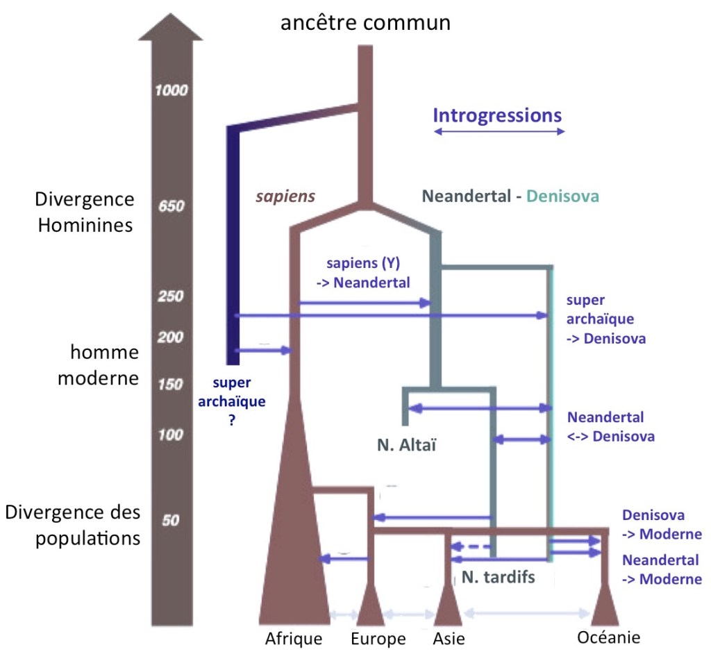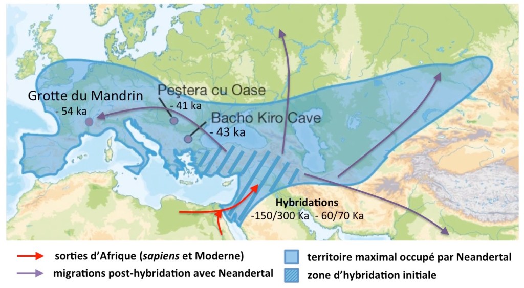 Après près de 400 000 années de présence et d’évolution en Eurasie, Neandertal disparaît brutalement il y a environ 40 000 ans. Cette disparition – comme celle de toutes les autres espèces humaines dites « archaïques » – coïncide avec l’arrivée de l’homme anatomiquement moderne (Moderne) sur son territoire, il y a environ 45 000 ans (Illustration#1). Les progrès de la paléogénomique et les travaux du groupe de Svante Pääbo ont montré qu’avant cette disparition, Moderne et Neandertal s’étaient « hybridés ». Comme preuve de ces échanges, « nous » portons dans notre patrimoine génétique les traces de cette ascendance lointaine. Tous les humains actuels en dehors de l’Afrique subsaharienne ont entre 1 et 4 % d’ADN de Neandertal dans leur génome, héritage des rencontres des Moderne sortant d’Afrique avec les Neandertal du Moyen-Orient il y a environ 60 000 ans, avant qu’ils ne partent vers l’est, le nord et l’ouest à la conquête du reste de la planète (NéO#11; PALéO#2.3). Des évènements similaires se sont produits en Asie où les Moderne se sont hybridés avec Denisova, un cousin de Neandertal qui peuplait ce continent (PALéO#2.5). Les asiatiques actuels ont donc dans leur génome des fragments d’ADN provenant de ces deux lignées.