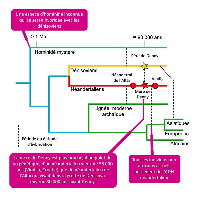Schéma publié sur le site Hominidés résumant ce qui était connu des hybridations entre Neandertal, Denisova et Moderne en 2018. Il insiste sur la découverte de Denny, hybride de première génération entre Denisova et Neandertal. Il y manque les hybridations décrites dans cette brève.