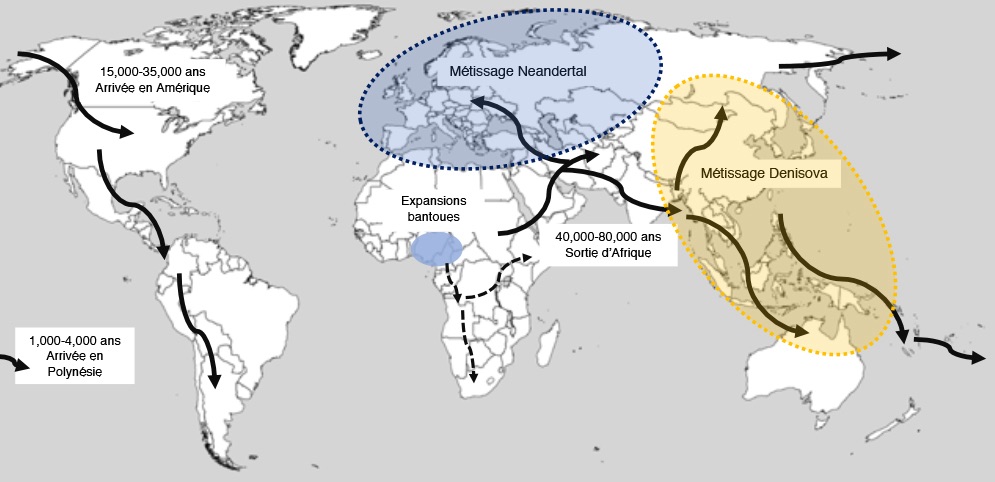 Denisova est le nom d’une grotte située dans le sud de la Sibérie, dans les monts de l’Altai, tout proche de la frontière de la Russie avec la Mongolie, la Chine et le Kazakhstan. Cette grotte est devenue célèbre non pas à cause de l’ermite Denis (Dionisij) qui y aurait vécu au XVIIIème siècle, mais suite à la découverte de l’espèce humaine qui lui doit son nom, par le séquençage de l’ADN contenu dans un petit bout de phalange d’une dénisovienne. Cet hominine reste bien mystérieux – très peu d’ossements fragmentaires (une demie mandibule, des phalanges et des dents) – mais, grâce au séquençage de son génome, on sait que ce cousin germain de Neandertal occupait l’Asie où au moins trois populations différentes y ont vécu jusqu’à il y a 30 000 ans, avant de disparaître, lui aussi, à l’arrivée des Modernes avec qui ils se sont reproduits, tout comme Neandertal en Europe. De nos jours, on retrouve la trace de ces hybridations chez les asiatiques et leurs descendants des Amériques, avec les plus fortes proportions chez les autochtones de Papouasie et les aborigènes d’Australie, le record d’introgressions denisoviennes étant cependant détenu par les Aytas de l’île de Luçon aux Philippines (chronique#2.5).